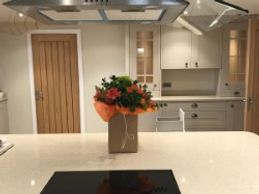 Cobblestone House is fitted with a customised modern kitchen designed to our clients specifications. The clean lines of the monochrome panelling with the downlight and mood enhancing floor lighting, create something rather special in contrast with the full height bi-fold doors that open out onto a patio with uninterrupted views.