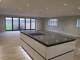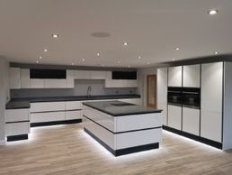 Fairfield View is fitted with a customised modern kitchen designed to our clients specifications. The clean lines of the monochrome panelling with the downlight and mood enhancing floor lighting, create something rather special in contrast with the full height bi-fold doors that open out onto a patio with uninterrupted views.